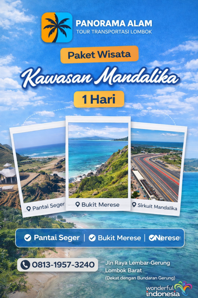 Nikmati serunya liburan di kawasan Mandalika, Lombok! Kamu akan diajak mengunjungi destinasi ikonik dengan pemandangan pantai yang indah, spot foto terbaik, hingga melihat langsung kemegahan Sirkuit Mandalika. Cocok untuk liburan singkat 1 hari yang tetap berkesan, nyaman, dan menyenangkan bersama keluarga maupun pasangan.
