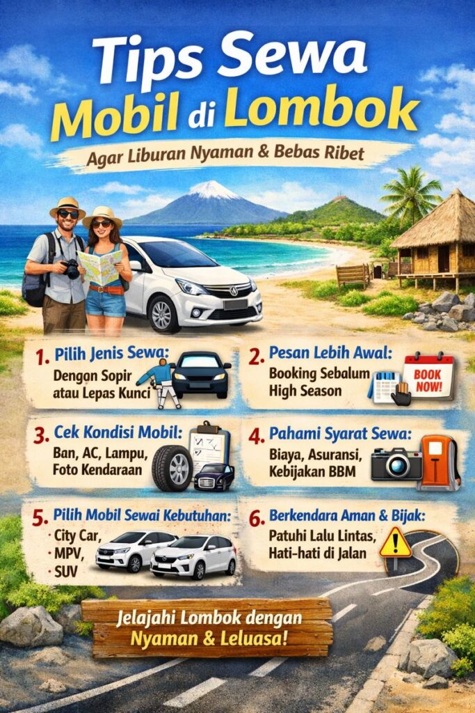 Menyewa mobil di Lombok adalah solusi terbaik untuk menikmati liburan secara maksimal. Dengan persiapan yang matang dan memilih rental mobil yang tepat, perjalanan wisata di Lombok akan terasa lebih nyaman, aman, dan menyenangkan.